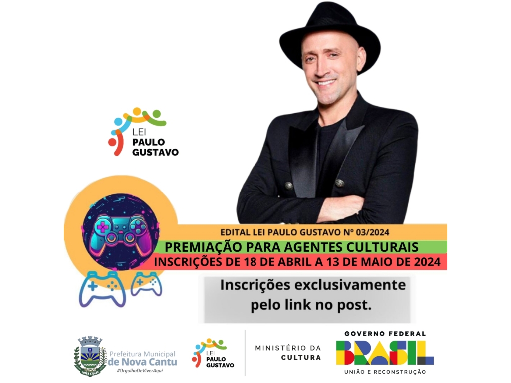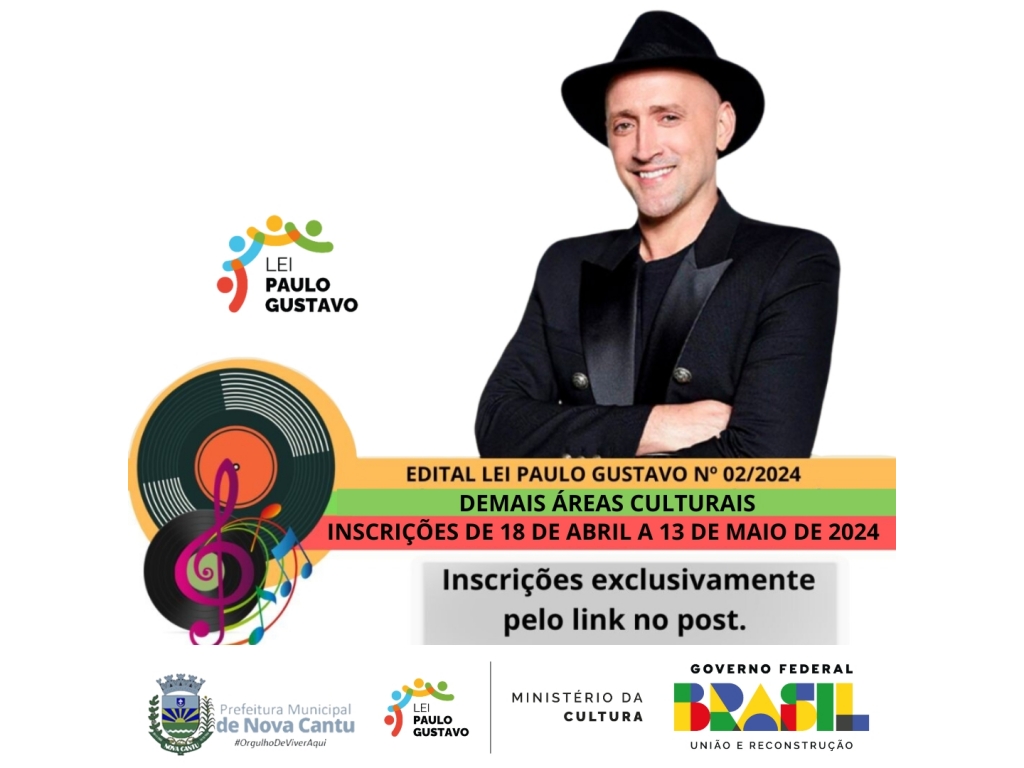 Os novos editais da Lei Paulo Gustavo de Nova Cantu, estão disponíveis e visam promover diferentes expressões culturais na cidade. Os Editais oferecem oportunidades para várias áreas culturais e para agentes culturais.